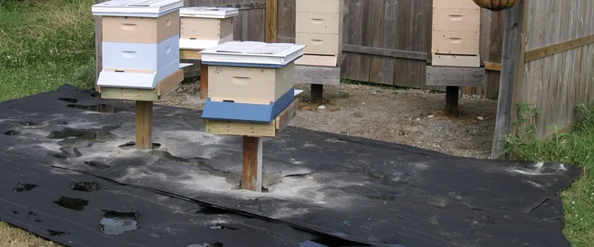 Use of gravel on top of 30# felt reduces weed growth and we believe small hive beetle reproduction. Hives on pedestals discourage skunk predation, mouse infestations, and ant invasions. Tarps, plastic, or landscape fabric would also work under gravel.