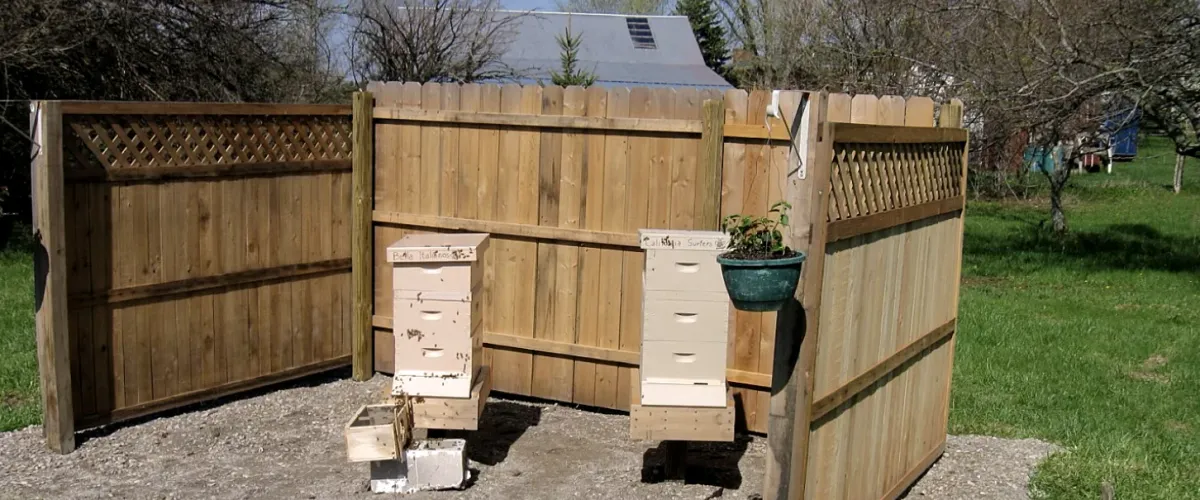 We chose a site for maximum sun and oriented the hive entrances to the southeast. We provided a winter windbreak on the East, North, and West sides of the apiary. Plants, fencing, straw bales, pallets, plywood, buildings, or a natural area will also work. We chose three panels of attractive fencing, but removed the panel on the East side after poor hive performance in the first two years due to excess shade. We have better survival from hives enjoying full sun in the apiary. Consider using attractive fencing to force bees to fly over a neighbor's property, even if ordinances do not require a barrier.